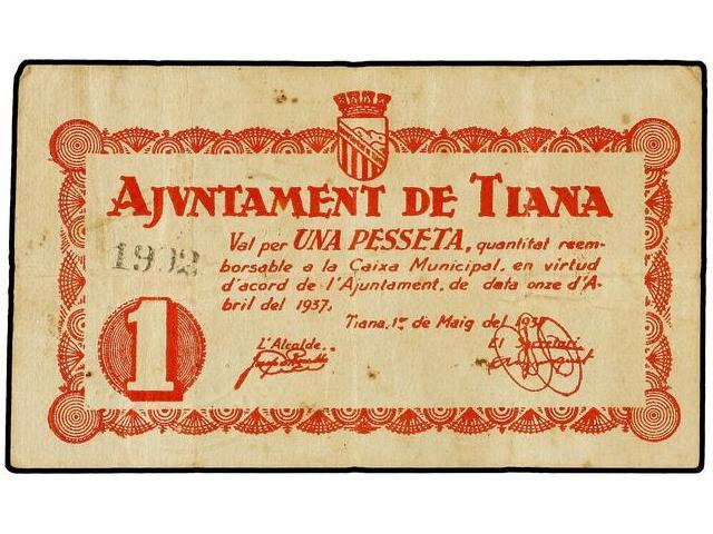 PAPER MONEY OF THE CIVIL WAR: CATALUNYA - 1 Pesseta. 1 Maig 1937. Aj. de TIANA. (Leves manchitas). AT-2461; T-2852. MBC.