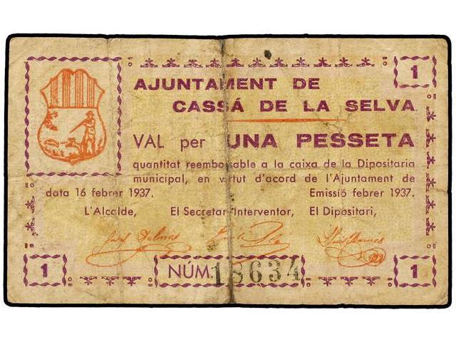 PAPER MONEY OF THE CIVIL WAR: CATALUNYA - 1 Pesseta. 16 Febrer 1937. Aj. de CASSÀ DE LA SELVA. MUY RARO. AT-687; T-806. BC+.