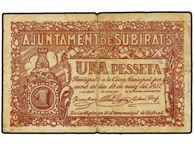 PAPER MONEY OF THE CIVIL WAR: CATALUNYA - 1 Pesseta. 16 Maig 1937. Aj. de SUBIRATS. (Roturas). AT-2408; T-2798. MBC-.
