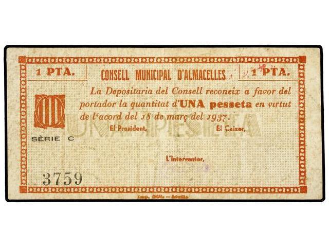 PAPER MONEY OF THE CIVIL WAR: CATALUNYA - 1 Pesseta. 18 Març 1937. C.M. d´ALMACELLES. ESCASO. AT-113i; T-151i. MBC.