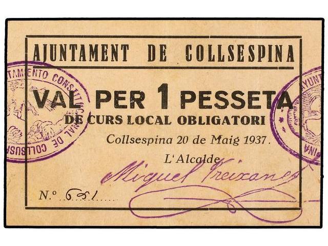 PAPER MONEY OF THE CIVIL WAR: CATALUNYA - 1 Pesseta. 20 Maig 1937. Aj. de COLLSESPINA. Cartón. Firma con sello tampón. MUY ESCASO. AT-860a; T-998a. MBC+.