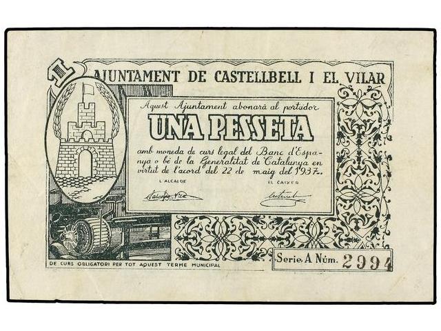 PAPER MONEY OF THE CIVIL WAR: CATALUNYA - 1 Pesseta. 22 Maig 1937. Aj. de CASTELLBELL I EL VILAR. AT-695; T-814. MBC+.
