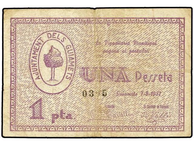 PAPER MONEY OF THE CIVIL WAR: CATALUNYA - 1 Pesseta. 7 Agost 1937. Aj. dels GUIAMETS. (Sucio). AT-1209; T-1386. MBC+.