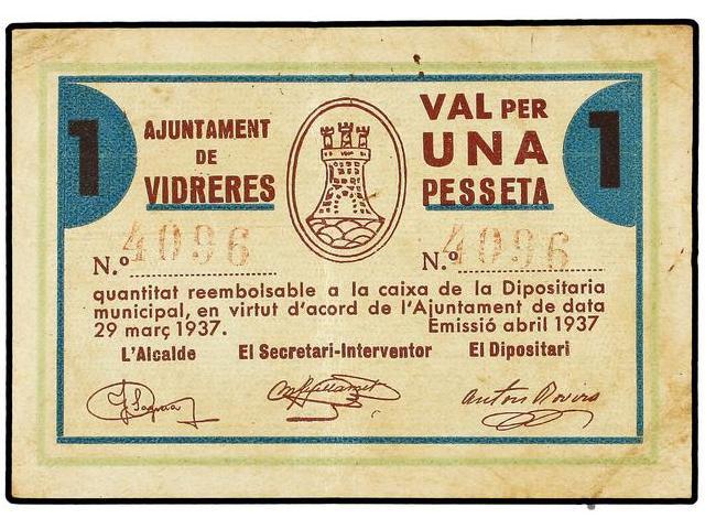 PAPER MONEY OF THE CIVIL WAR: CATALUNYA - 1 Pesseta. Abril 1937. Aj. de VIDRERES. (Sucio). AT-2738; T-3159. MBC+.