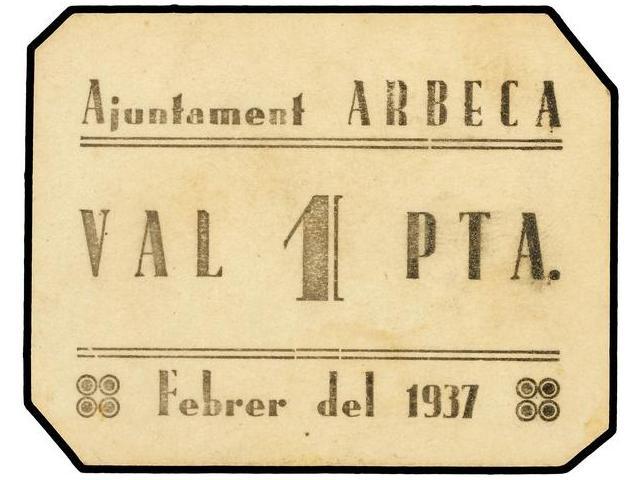 PAPER MONEY OF THE CIVIL WAR: CATALUNYA - 1 Pesseta. Febrero 1937. Aj. ARBECA. Cartulina. ESCASO. AT-164b ; T-220b. (SC).