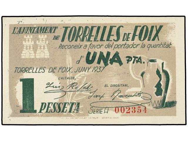 PAPER MONEY OF THE CIVIL WAR: CATALUNYA - 1 Pesseta. Juny 1937. Aj. de TORRELLES DE FOIX. AT-2553; T-2970. SC.