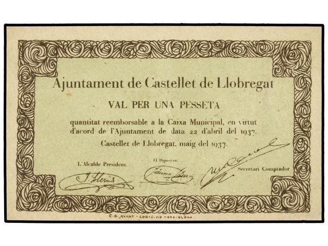 PAPER MONEY OF THE CIVIL WAR: CATALUNYA - 1 Pesseta. Maig 1937. Aj. de CASTELLET DE LLOBREGAT. AT-718; T-842. MBC+.