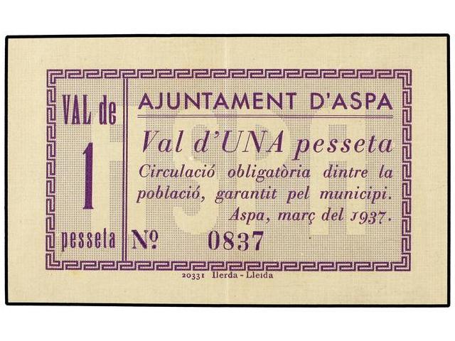 PAPER MONEY OF THE CIVIL WAR: CATALUNYA - 1 Pesseta. Març 1937. Aj. d´ASPA. Timbre rojo. ESCASO. AT-244; T-304. EBC+.