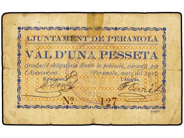 PAPER MONEY OF THE CIVIL WAR: CATALUNYA - 1 Pesseta. Març 1937. Aj. de PERAMOLA. (Rotura reparada en pliegue central. Roturas y manchas). RARO. AT-1808b; T-2092b. BC+.