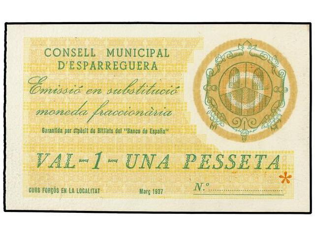 PAPER MONEY OF THE CIVIL WAR: CATALUNYA - 1 Pesseta. Març 1937. C.M. d´ESPARRAGUERA. AT-934d; T-1072d. SC.