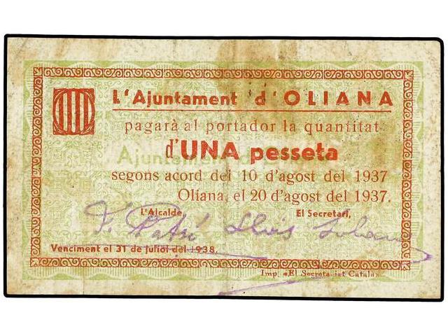 PAPER MONEY OF THE CIVIL WAR: CATALUNYA - 1 Pesseta. S/F. Aj. d´OLIANA. (Manchas). AT-1688; T-1937. MBC.