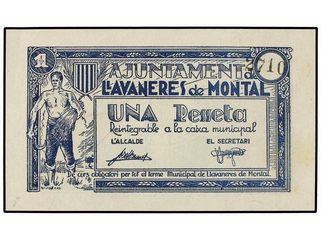 PAPER MONEY OF THE CIVIL WAR: CATALUNYA - 1 Pesseta. S/F. Aj. de LLAVANERES DE MONTAL. (Leves manchas del tiempo). ESCASO. AT-1335a; T-1528a. SC.