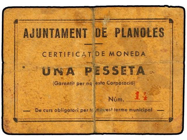 PAPER MONEY OF THE CIVIL WAR: CATALUNYA - 1 Pesseta. S/F. Aj. de PLANOLES. (Pliegue central reparado con cinta adhesiva). RARO. AT-1875; T-2169. BC+.