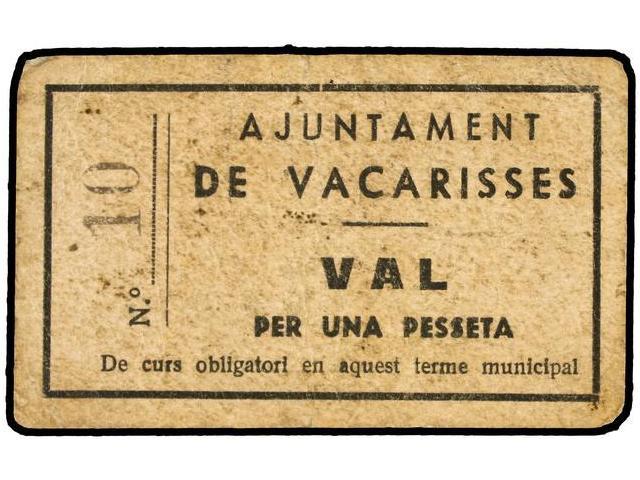PAPER MONEY OF THE CIVIL WAR: CATALUNYA - 1 Pesseta. S/F. Aj. de VACARISSES. Cartón. (Algo sucio). MUY ESCASO. AT-2626b; T-3045b. MBC+.
