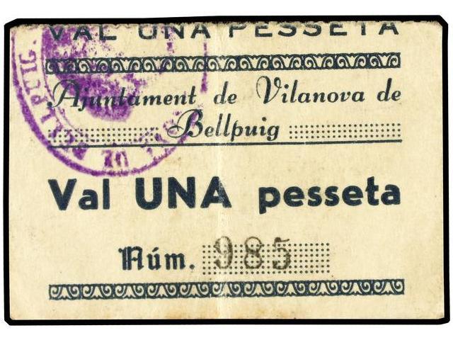 PAPER MONEY OF THE CIVIL WAR: CATALUNYA - 1 Pesseta. S/F. Aj. de VILANOVA DE BELLPUIG. MUY ESCASO. AT-2834; T-3265. EBC-.