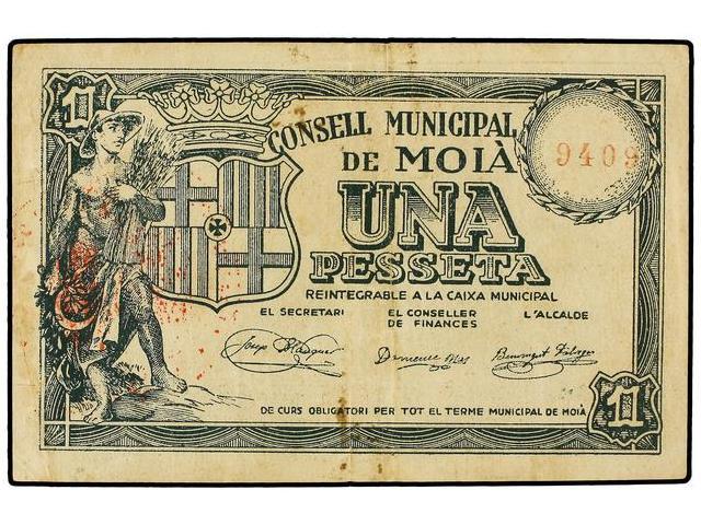 PAPER MONEY OF THE CIVIL WAR: CATALUNYA - 1 Pesseta. S/F. C.M. de MOIÀ. (Pequeña manchita). AT-1504; T-1724. EBC-.