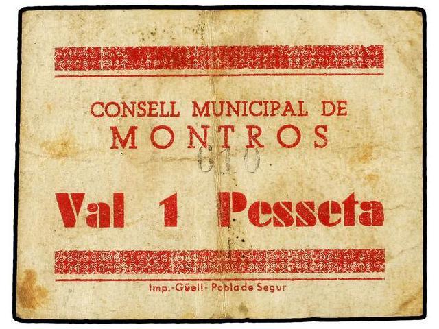 PAPER MONEY OF THE CIVIL WAR: CATALUNYA - 1 Pesseta. S/F. C.M. de MONTRÓS. (Manchitas). MUY ESCASO. AT-1607; T-1843. MBC-.