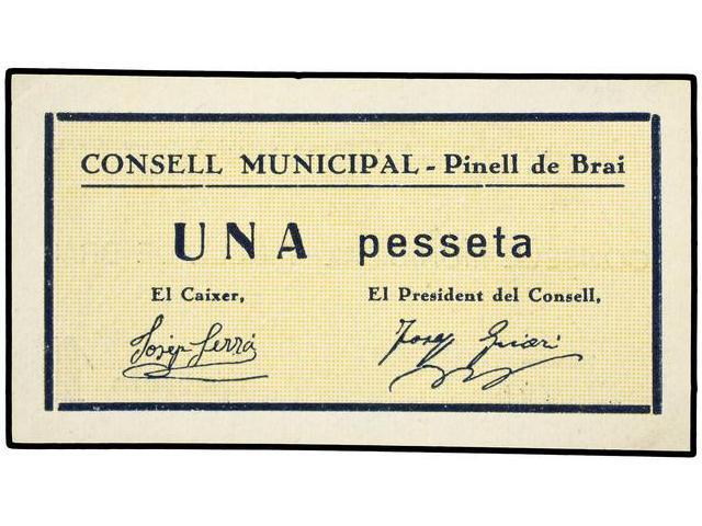PAPER MONEY OF THE CIVIL WAR: CATALUNYA - 1 Pesseta. S/F. C.M. de PINELL DE BRAI. ESCASO. AT-1838; T-2122. EBC.