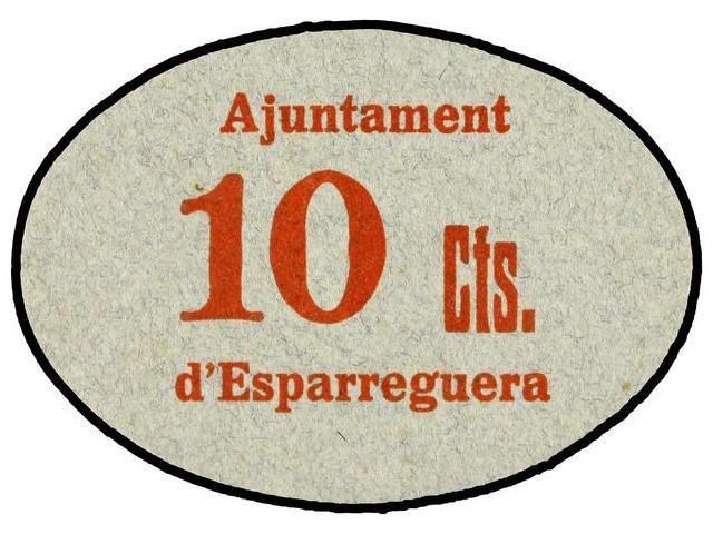 PAPER MONEY OF THE CIVIL WAR: CATALUNYA - 10 Cèntims. S/F. Aj. d´ESPARRAGUERA. Cartón ovalado. MUY RARO. AT-939a; T-1077a. SC.