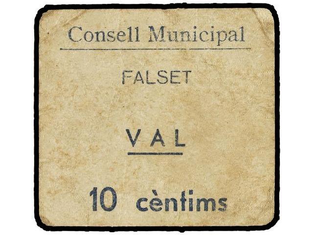 PAPER MONEY OF THE CIVIL WAR: CATALUNYA - 10 Cèntims. S/F. C.M. FALSET. Cartulina. MUY ESCASO. AT-842 ; T-981. MBC-.
