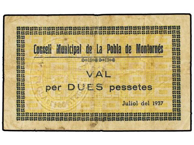 PAPER MONEY OF THE CIVIL WAR: CATALUNYA - 2 Pessetes. Juliol 1937. C.M. de LA POBLA DE MONTORNES. MUY ESCASO. AT-1915; T-2209. MBC-.