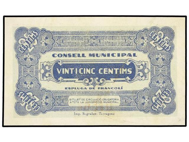PAPER MONEY OF THE CIVIL WAR: CATALUNYA - 25 Cèntims. 14 Maig 1937. C.M. d´ESPLUGA DE FRANCOLÍ. (Pequeñas manchitas). AT-957; T-1094. EBC.