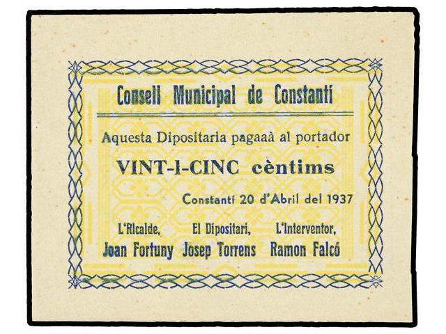 PAPER MONEY OF THE CIVIL WAR: CATALUNYA - 25 Cèntims. 20 Abril 1937. C.M. de CONSTANTÍ. (Restos de adhesivo en reverso). ESCASO. AT-868a; T-1006a. SC.