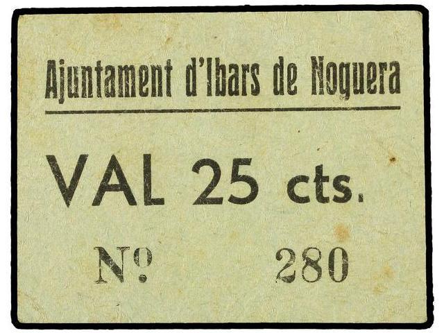 PAPER MONEY OF THE CIVIL WAR: CATALUNYA - 25 Cèntims. Aj. d´IBARS DE NOGUERA. Cartulina. (Manchitas). MUY RARO. AT-1266; T-1442. MBC+.