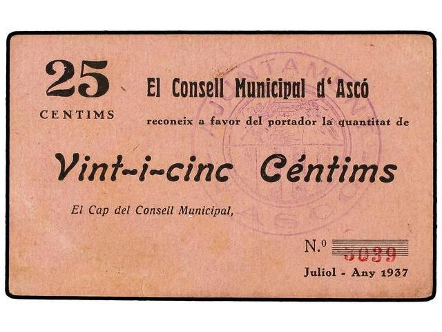 PAPER MONEY OF THE CIVIL WAR: CATALUNYA - 25 Cèntims. Juliol 1937. C.M. d´ASCÓ. Cartoncillo. (Algo sucio). MUY ESCASO. AT-242a; T-303a. EBC-.