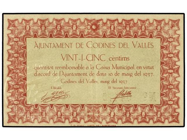 PAPER MONEY OF THE CIVIL WAR: CATALUNYA - 25 Cèntims. Maig 1937. Aj. de CODINES DEL VALLÈS. AT-841; T-980. EBC-.