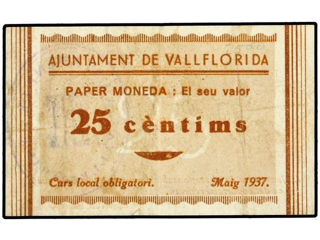 PAPER MONEY OF THE CIVIL WAR: CATALUNYA - 25 Cèntims. Maig 1937. Aj. de VALLFLORIDA. (Algo sucio). ESCASO. AT-2662; T-3080. MBC+.