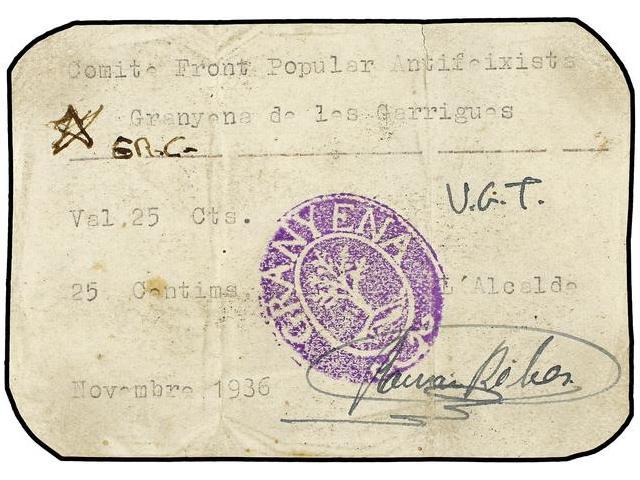PAPER MONEY OF THE CIVIL WAR: CATALUNYA - 25 Cèntims. Noviembre 1936. COMITÉ FRONT POPULAR ANTIFEIXISTA. GRANYENA DE LES GARRIGUES. Firma del alcalde Ramón Ribas. (Reparación con cinta adhesiva). MUY RARO. AT-1180d. MBC+.