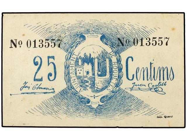 PAPER MONEY OF THE CIVIL WAR: CATALUNYA - 25 Cèntims. S/F. Aj. de ROQUETES. ESCASO. AT-2206; T-2547. S/C-.