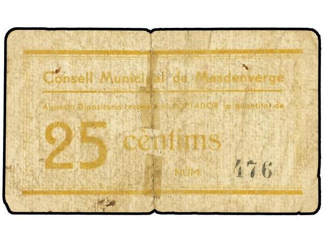 PAPER MONEY OF THE CIVIL WAR: CATALUNYA - 25 Cèntims. S/F. C.M. de MASDENVERGE. (Roturas. Pliegue central reparado con cinta adhesiva. Sucio). AT-1465; T-1471. BC+.