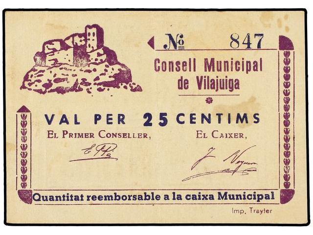 PAPER MONEY OF THE CIVIL WAR: CATALUNYA - 25 Cèntims. S/F. C.M. de VILAJUIGA. (Manchitas). MUY ESCASO. AT-2790; T-3226. EBC.