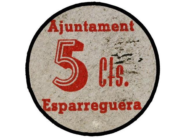 PAPER MONEY OF THE CIVIL WAR: CATALUNYA - 5 Cèntims. S/F. Aj. d´ESPARRAGUERA. Cartulina circular. (Manchitas). MUY RARO. AT-944. MBC+.