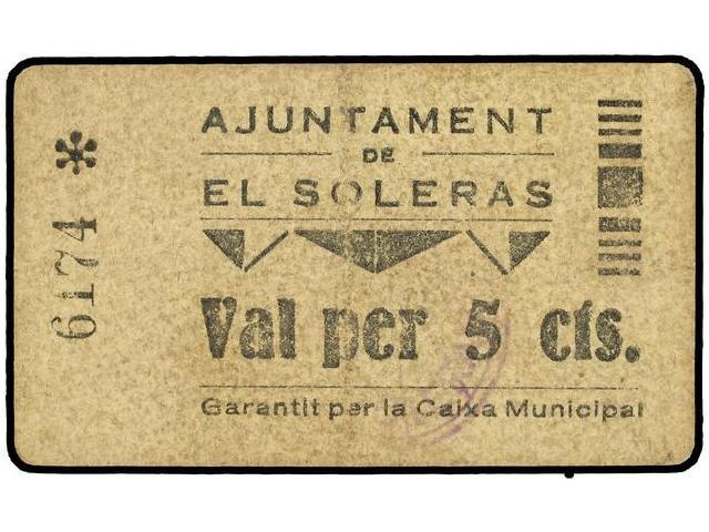 PAPER MONEY OF THE CIVIL WAR: CATALUNYA - 5 Cèntims. S/F. Aj. de EL SOLERÀS. Cartón. (Algo sucio). AT-2386a; T-2765a. MBC+.