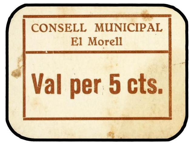 PAPER MONEY OF THE CIVIL WAR: CATALUNYA - 5 Cèntims. S/F. C.M. d´EL MORELL. Cartón. (Manchitas). MUY ESCASO. AT-1627; T-1873. EBC-.