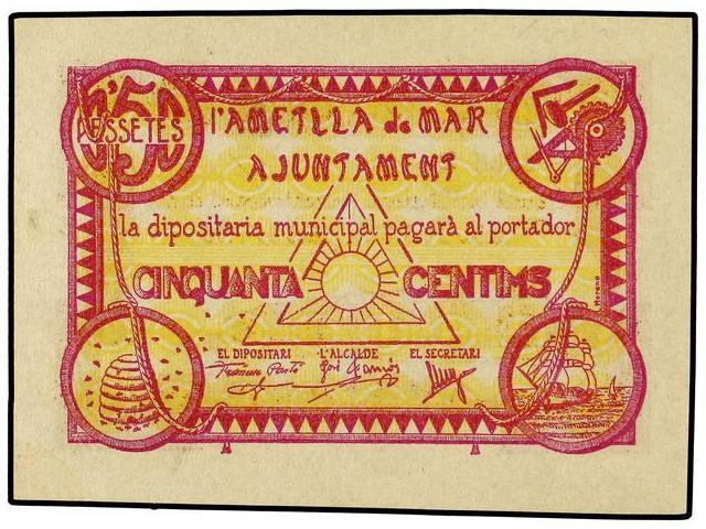 PAPER MONEY OF THE CIVIL WAR: CATALUNYA - 50 Cèntims. 1 Juliol 1938. Aj. d´AMETLLA DE MAR. AT-139a; T-190a. SC.