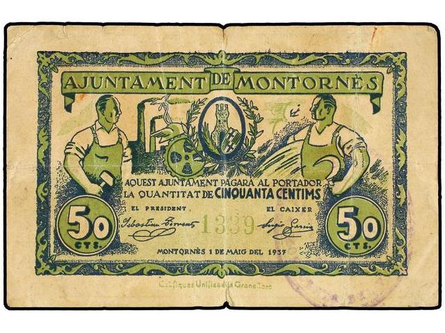 PAPER MONEY OF THE CIVIL WAR: CATALUNYA - 50 Cèntims. 1 Maig 1937. Aj. de MONTORNÈS. (Pequeñas roturas). AT-1592; T-1828. MBC.
