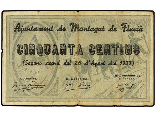 PAPER MONEY OF THE CIVIL WAR: CATALUNYA - 50 Cèntims. 26 Agost 1937. Aj. de MONTAGUT DE FLUVIÀ. (Pequeñas roturas. Sucio). AT-1535a; T-1760a. MBC.
