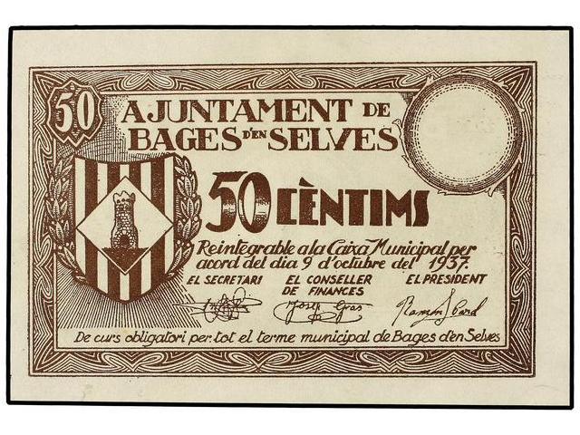 PAPER MONEY OF THE CIVIL WAR: CATALUNYA - 50 Cèntims. 9 Octubre 1937. Aj. de BAGES D´EN SELVES. ESCASO. AT-265b; T-331b. SC.