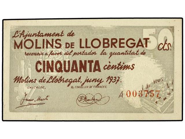 PAPER MONEY OF THE CIVIL WAR: CATALUNYA - 50 Cèntims. Juny 1937. Aj. de MOLINS DE LLOBREGAT. AT-1508; T-1730. SC.