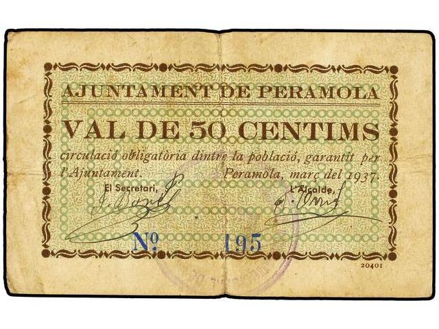 PAPER MONEY OF THE CIVIL WAR: CATALUNYA - 50 Cèntims. Març 1937. Aj. de PERAMOLA. (Oxidaciones de clip. Pliegue central reparado con cinta adhesiva). AT-1809b; T-2093b. BC+.