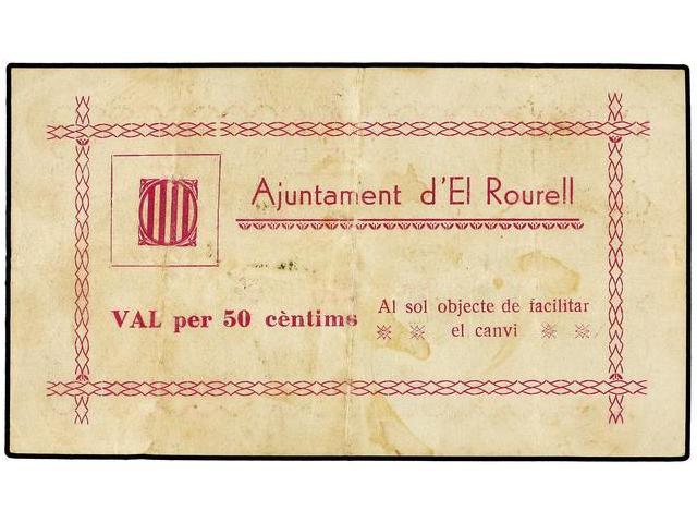 PAPER MONEY OF THE CIVIL WAR: CATALUNYA - 50 Cèntims. S/F. Aj. d´EL ROURELL. (Pequeñas manchitas y restos de adhesivo en reverso). MUY ESCASO. AT-2224; T-2565. MBC+.