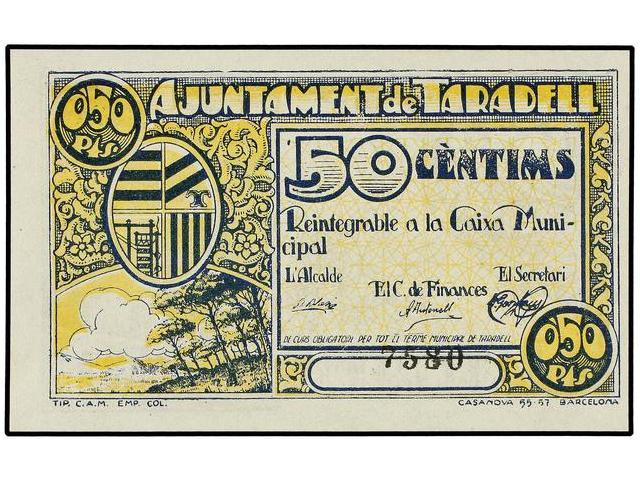 PAPER MONEY OF THE CIVIL WAR: CATALUNYA - 50 Cèntims. S/F. Aj. de TARADELL. AT-2433; T-2825. SC.