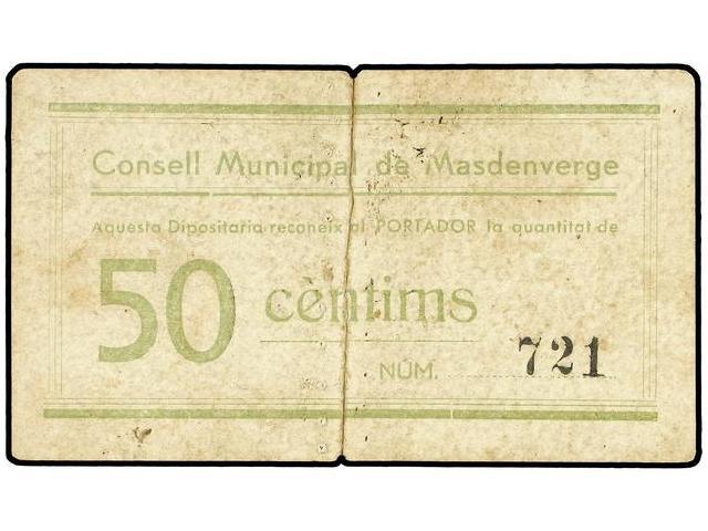 PAPER MONEY OF THE CIVIL WAR: CATALUNYA - 50 Cèntims. S/F. C.M. de MASDENVERGE. (Rotura reparada con cinta adhesiva. Múltiples puntos de aguja. Sucio). ESCASO. AT---1464; T1670. BC+.
