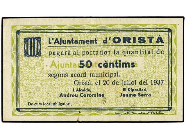 PAPER MONEY OF THE CIVIL WAR: CATALUNYA - 50 Cèntims. s/f. Aj. d´ORISTÀ. (Manchitas). AT-1720a; T-1975a. EBC-.