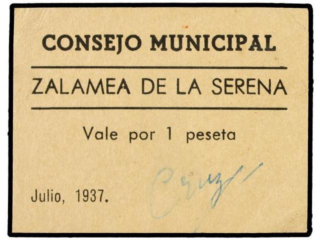 PAPER MONEY OF THE CIVIL WAR: EXTREMADURA - 1 Peseta. Julio 1937. C.M. de ZALAMEA DE LA SERENA (Badajoz). Cartón. Mont-1652C. EBC.