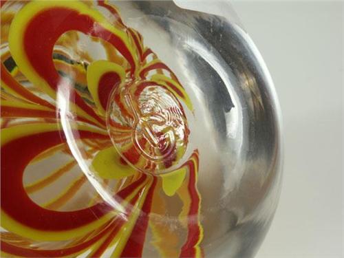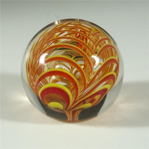 PAPERWEIGHT: A round 2'' x 3 ¬'' clear blown glass paperweight having stripe dual lines of orange and red undulating from the base up and out then spreading into a triangle shaped form. The base has an indented pontil which contains the formed letters G or C and L (Lundberg Studios??). A minute rub mark noted.
